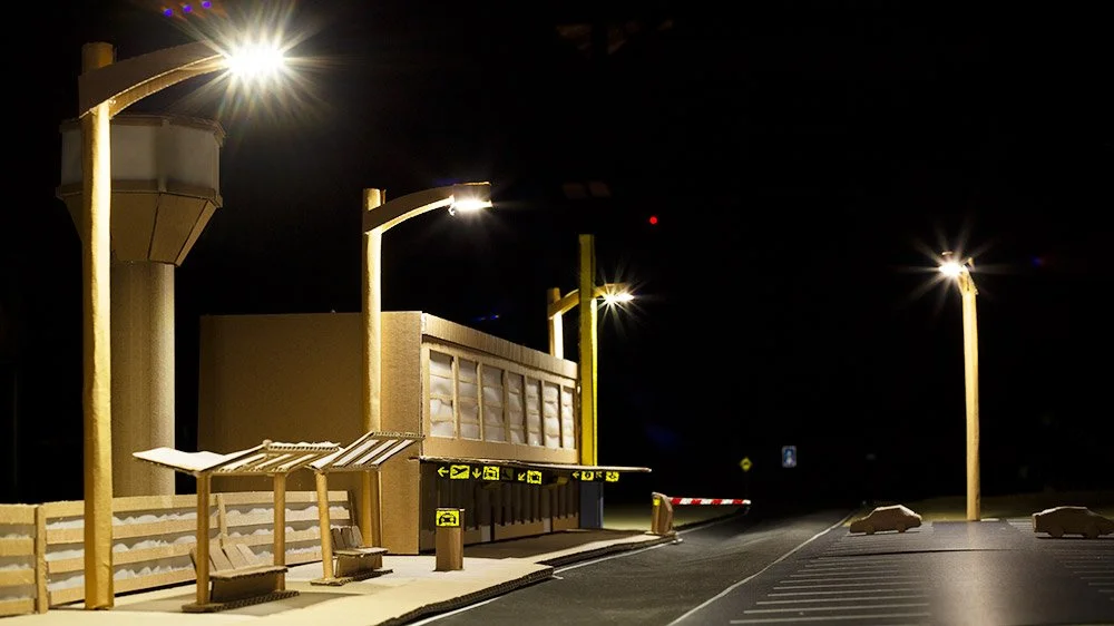 All the lighting in the exterior sets came from real LED street lights in the set – due to the complex nature of the shoot and difficulties associated with post-production to remove lighting rigs, it wasn’t possible to use lights as you would in a standard stop-motion shoot.